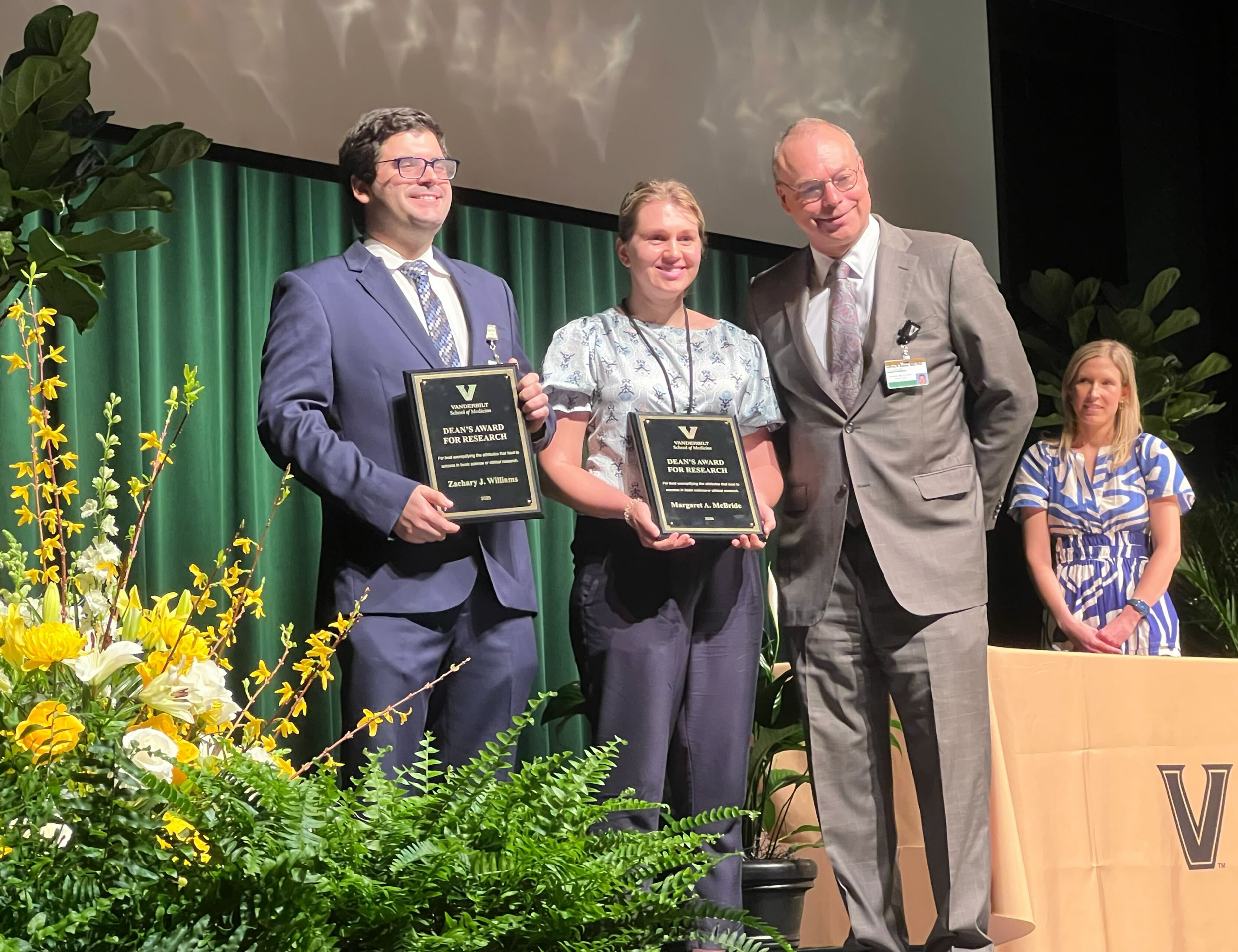 Congratulations to recent graduates Drs. Margaret McBride, Alex Silver, and Zachary Williams on receiving the Dean’s Award for Research this year! This award is presented to graduating medical students who best exemplify the attributes that lead to success in basic science or clinical research, namely creativity, dedication, productivity, and careful diligence.
