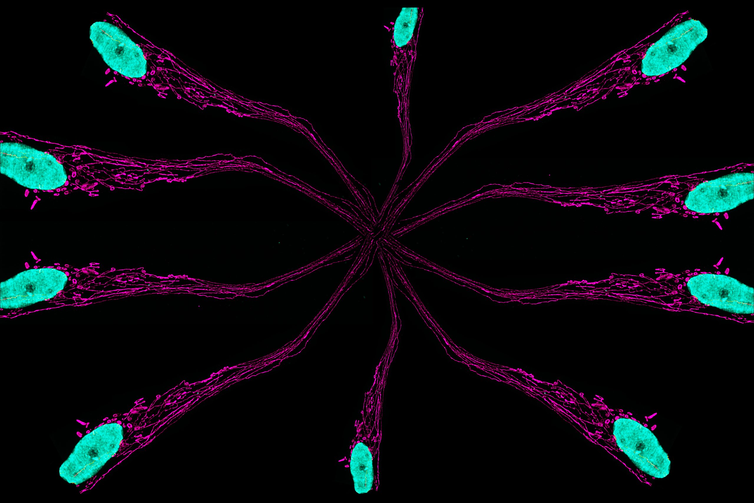 Immunofluorescence images were taken of induced pluripotent stem cell–derived, day 200+ neurons using Hoechst to stain for nuclei and anti-mitochondria antibodies to stain for mitochondria. The resulting image shows the mitochondria traveling through an axonal/dendritic projection from a single neuron. Deconvolution and duplication of the image resulted in a web-like design for an artistic effect.