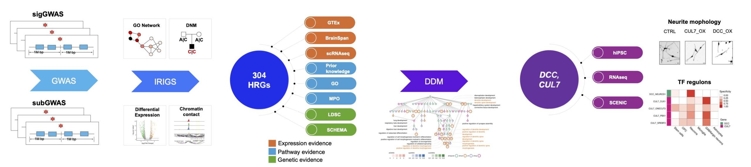 - iPSC modeling confirms abnormal dendritic morphogenesis: When testing two of the near-miss genes (DCC and CUL7) in human induced pluripotent stem cell–derived neurons, we saw that increasing their expression caused the neurons to grow shorter and fewer branches, directly linking genetic risk to real changes in brain structure.