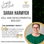 Feb. 12, 2026—Congrats, Dr. Harmych Who: Sarah Harmych, PhD Department: Cell and Developmental Biology PI Mentor: Dr. Bhuminder Singh Research: Utilizing the shape of 3D cancer colonies to improve treatment response in colorectal cancer. Vanderbilt Impact: “The high throughput screening core had a huge impact on my training. They helped me extensively with optimizing the drug screen...