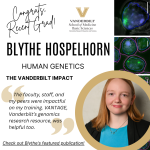 Aug. 25, 2025—Congrats, Dr. Hospelhorn! Who: Blythe Hospelhorn, PhD Department: Human Genetics PI Mentor: Dr. Gregor Neuert Research: Gene regulatory dynamics in stress stimulus response Vanderbilt Impact: “The faculty, staff, and my peers were impactful on my training. VANTAGE, Vanderbilt’s genomics research resource, was helpful too. ” Post-PhD Plans: I am looking for an academic/public/nonprofit postdoctoral fellowship.