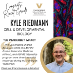 Aug. 27, 2025—Congrats, Dr. Riedmann! Who: Kyle Riedmann, PhD Department: Cell & Developmental Biology PI Mentor: Dr. Julie Bastarache Research: The impact of cell free hemoglobin on the blood vessels that line the lungs. Vanderbilt Impact: “The Cell Imaging Shared Resource (CISR), the ASPIRE Path in Molecular Medicine (APMM), and ASPIRE internship program were three impactful resources...