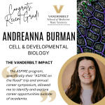 Feb. 11, 2026—Congrats, Dr. Burman! Who: Andreanna Burman, PhD Department: Cell and Developmental Biology PI Mentor: Dr. Izumi Kaji and Dr. Jim Goldenring Research: My research studied intestinal stem cell dysfunction in Microvillus Inclusion Disease (MVID). Vanderbilt Impact: “Several core facilities (DHSR, TPSR, CISR) were instrumental in moving my research forward. The ASPIRE program, specifically their “ASPIRE...