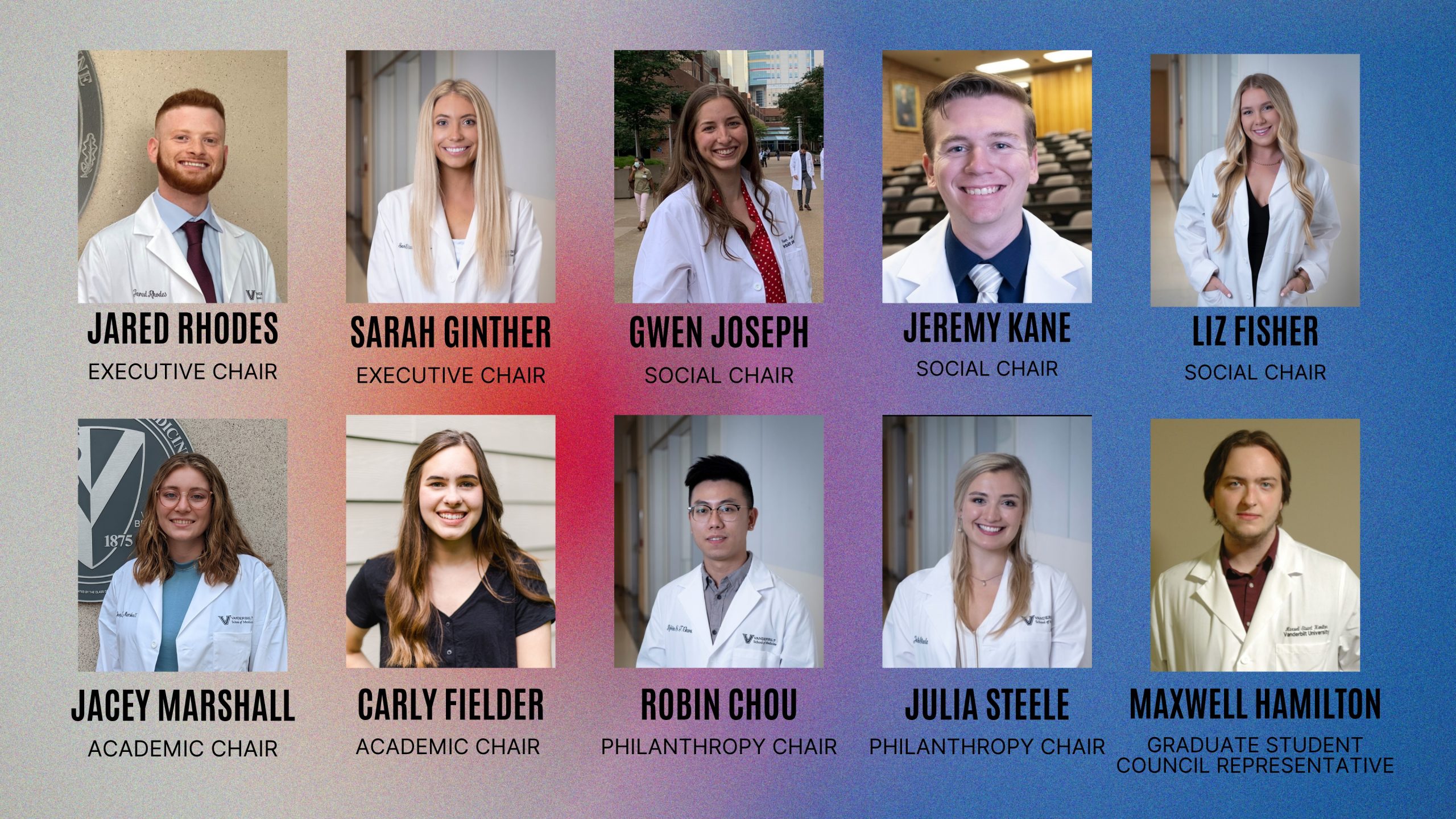 Elysa Pierro and KayLee Steiner – Executive Chairs, Jared Rhodes, Sarah Ginther, and Logan Vlach – Philanthropy Chairs, Gwenyth Joseph and Jeremy Kane, Social Chairs, Emma Hathaway – Academic Chair, Maxwell Hamilton – Graduate Student Council Representative