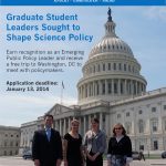 Nov. 25, 2013—Graduate students in the biological sciences who have demonstrated initiative and leadership in science policy can apply today for the Emerging Public Policy Leadership Award. Recipients obtain first-hand experience at the interface of science and public policy. Winners will receive a trip to Washington, DC, to participate in the Biological and Ecological Sciences Coalition Congressional Visits Day, an annual...