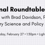 Feb. 10, 2026—Informal Roundtable Session with Brad Davidson, PhD, Regulatory Science and Policy Analyst, AACR Friday, February 27 • 1:30pm • Light Hall 407 Please join us on Friday, February 27 for an informal discussion with alumnus Brad Davidson, PhD, Regulatory Science and Policy Analyst within the Office of Science Policy and Government Affairs of the American Association of Cancer Research (AACR). Dr. Davidson will...