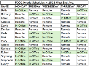 POD2 administrative staff are working under an Alternative Work Arrangement (AWA) schedule. Please refer to the following hybrid/remote work schedule for the staff.