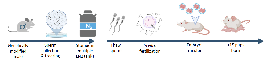Sperm cryopreservation requires two male mice that are proven breeders from the colony. The cryopreservation service includes the quality control check of thawing one or two straws of sperm and performing a small scale in vitro fertilization (IVF) to produce 2-cell stage embryos. Additional breeding steps may be required if more than one mutation is involved when re-deriving a line from cryopreserved sperm.