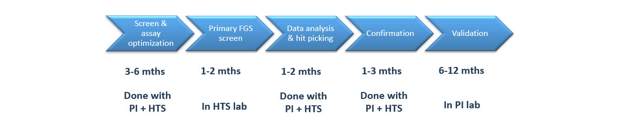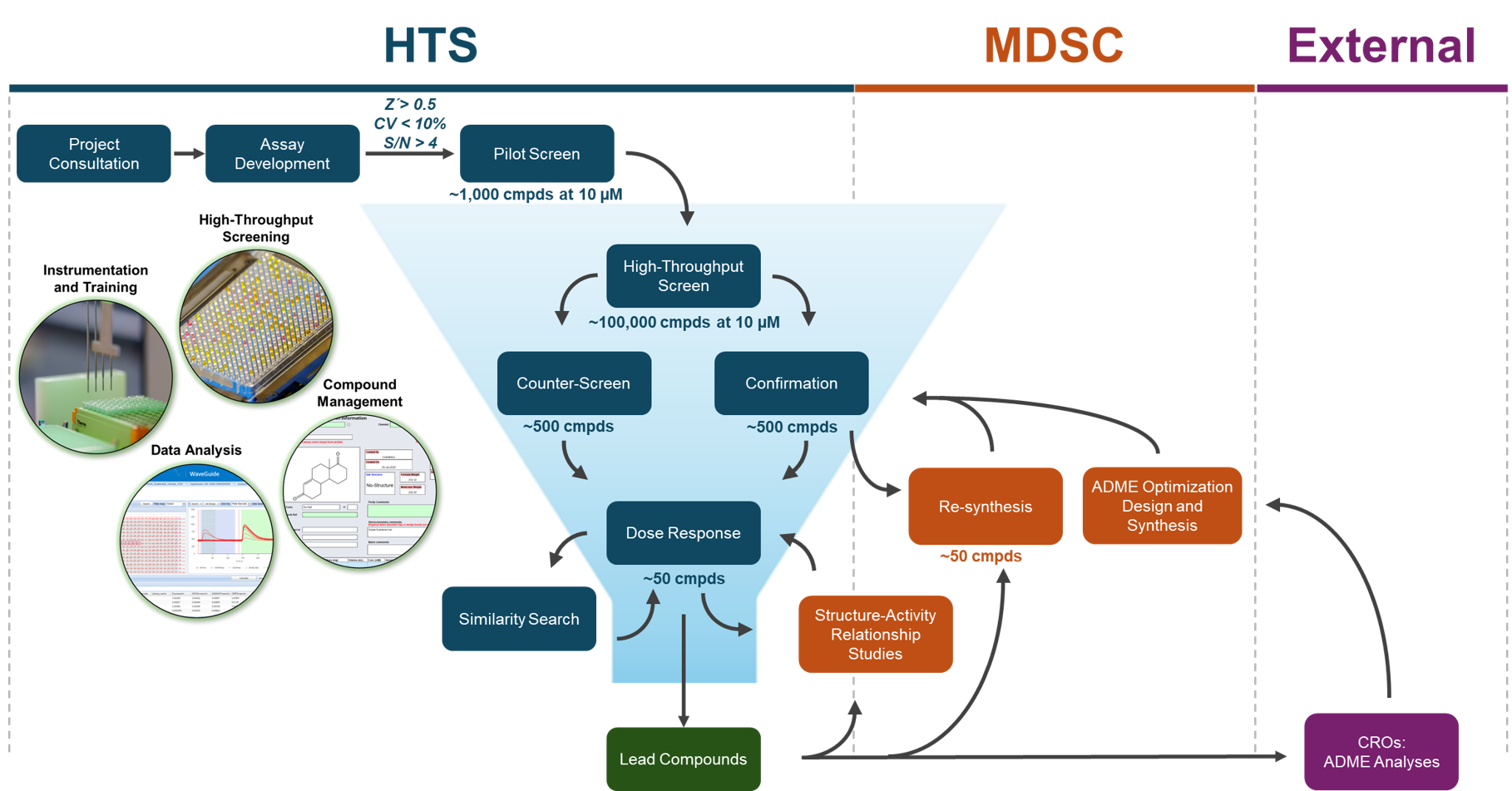 Projects begin with a consultation to set goals, define success measures, and adapt assays for automated HTS. HTS staff assist with assay development, validation, and pilot screening to ensure robust performance. Once optimized, a full screen identifies initial hits (~0.5%), followed by confirmation tests, re-synthesis or vendor reorders, and counter-screens to eliminate false positives.