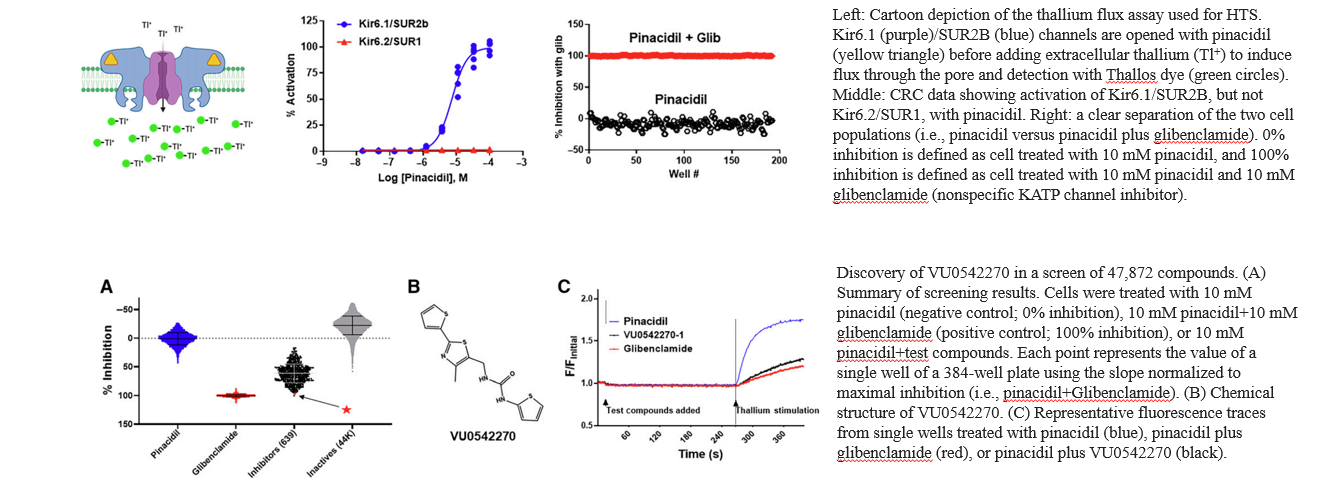 Small-molecule inhibitors of vascular smooth muscle Kir6.1/SUR2B KATP channels represents novel therapeutics for patent ductus arteriosus, migraine headache, and sepsis; however, the lack of selective channel inhibitors has slowed progress in these therapeutic areas. A high-throughput screen performed on Panoptic Imaging Platform led to the discovery of the first vascular-specific KATP channel inhibitor, VU0542270.
